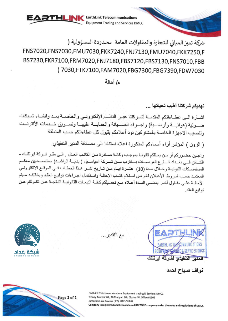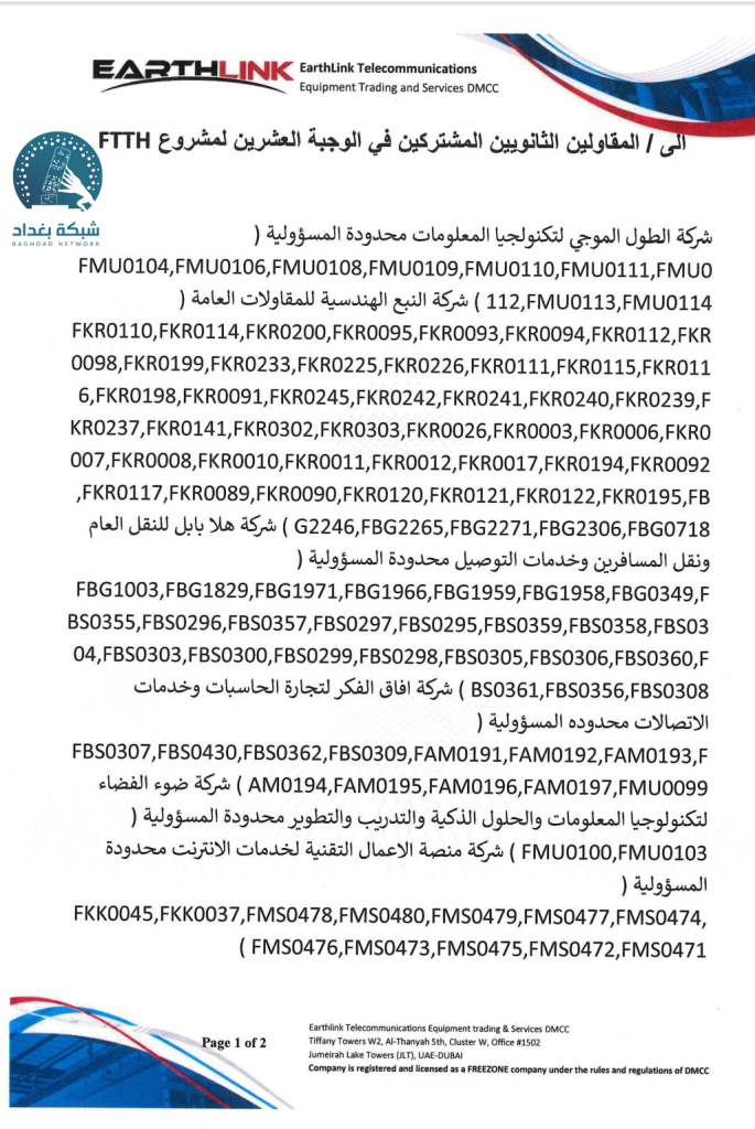 كشفت وثائق رسمية حصلت عليها شبكة بغداد أن مشروع الكابل الضوئي (FTTH) الذي تنفذه وزارة الاتصالات بالتعاون مع شركة إيرثلنك، تمت إحالة أجزاء واسعة منه إلى مقاولين ثانويين لا يقتصر نشاطهم على قطاع الاتصالات، بل يمتد ليشمل شركات نقل المسافرين والمقاولات العامة، وهو ما أثار استغراب المراقبين.